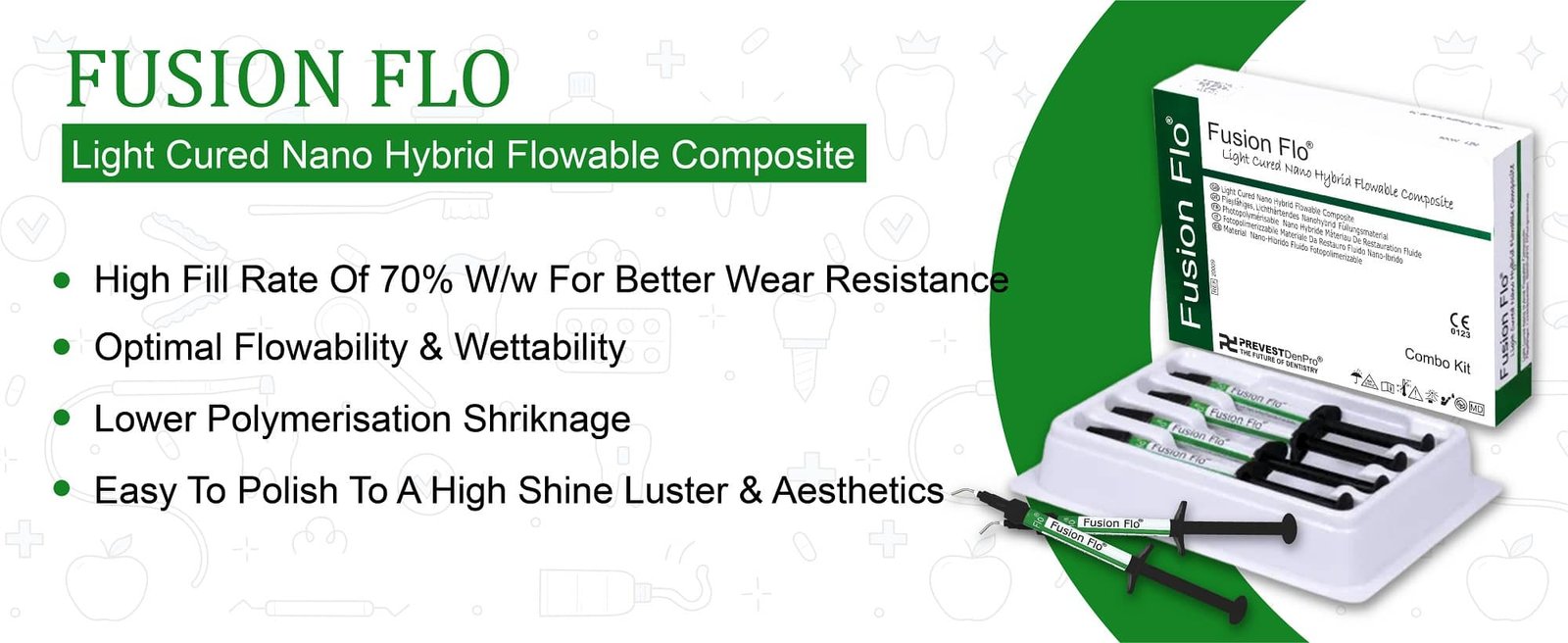 Precautions : Eugenol containing materials should not be used with this product because they may effect polymerization and interfere with the hardening process. Being sensitive to heat and light, the syringes should be kept away from direct sun light.