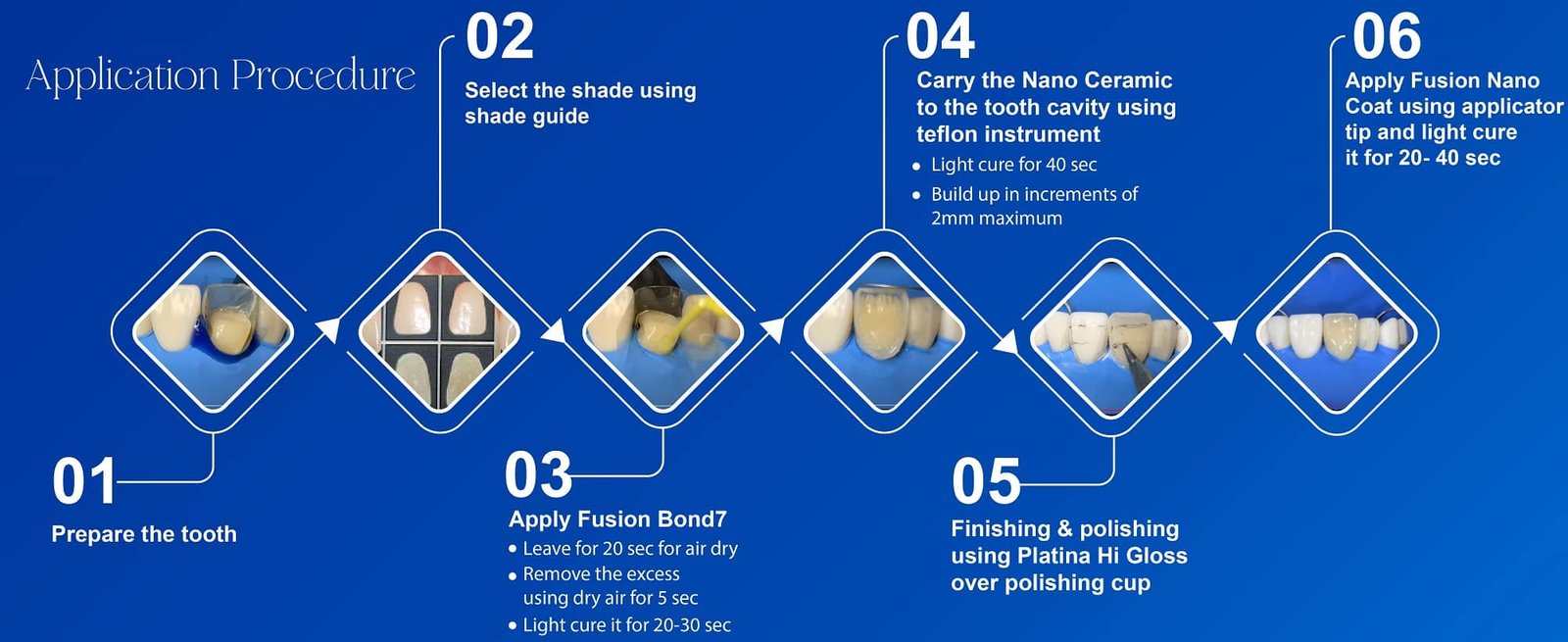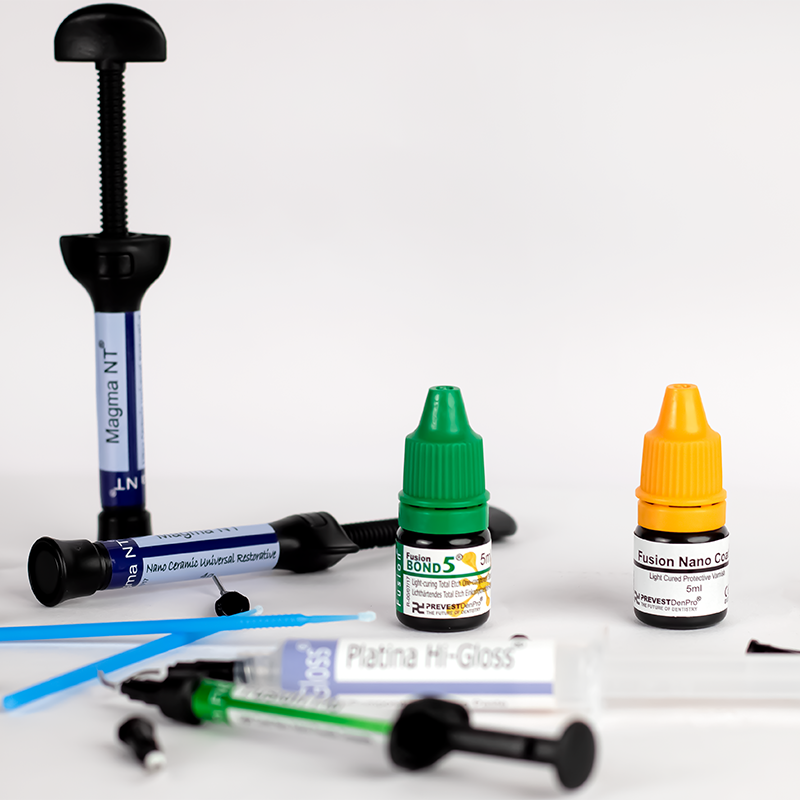 Indications for Use : Magma NT Nano Ceramic Universal Restorative is indicated for direct filling of class I, II, III, IV close to the pulp with hard setting CAL-LC Light Cure Calcium Hydroxide paste. Apply Fusion Bond 7 dentine bonding agent with a disposable brush to the entire cavity. Ensure thorough wetting of the entire cavity. Allow 20 sec air drying and re apply another coat of dentine bonding agent. Remove excess solvent by gently drying with dry air for at least 5sec to ensure uniform glossy surface. Cure adhesive for 20-30 sec using standard curing light. Remove Magma NT syringe cap and dispense material onto a mixing pad. Place the material into the cavity using a clean unabraded instrument (teflon coated). After dispensing, screw plunger should be rotated anticlockwise by half to full turn to release residual pressure inside the syringe. Contour the material in the cavity. Light cure for 40 sec using standard curing light. When necessary build in increments of 2mm maximum using a layering technique. Shape and polish with Platina Hi Gloss using standard technique and at the last stage apply Fusion Nano Coat. The dispensed material shall not be placed back in the container and the dose once applied and used shall not be reused.