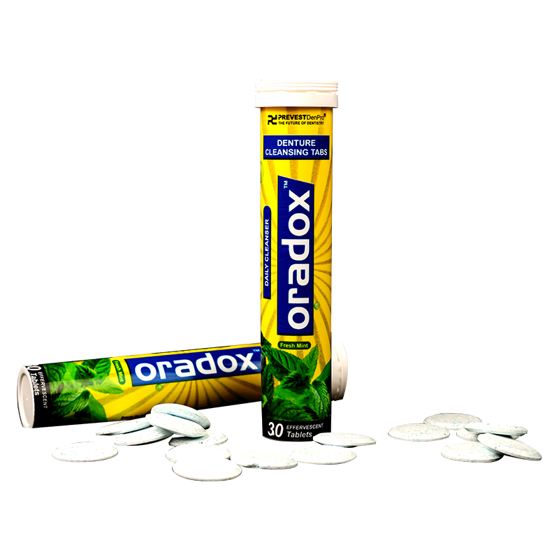 Place the denture in a glass of 150ml of warm water (33°C to 47°C) ensuring that it is fully immersed and immediately drop one oradox denture cleansing tablet in the water. Soak for a minimum of 15 minutes to ensure reduction of the biofilm. Acrylic appliances can be soaked overnight. Brush can be used if necessary. Remove the denture from the solution and rinse well under water before oral application.