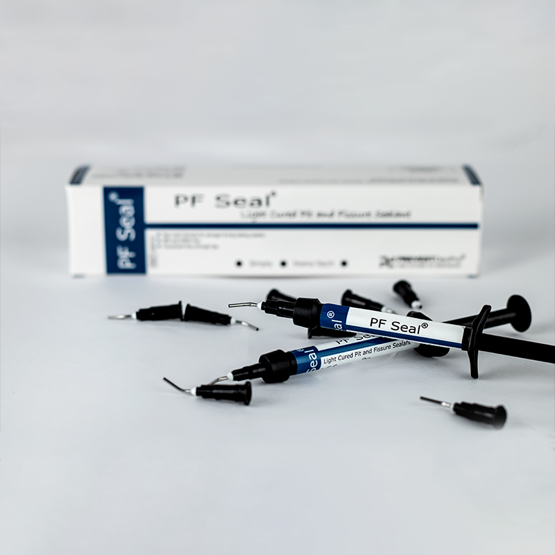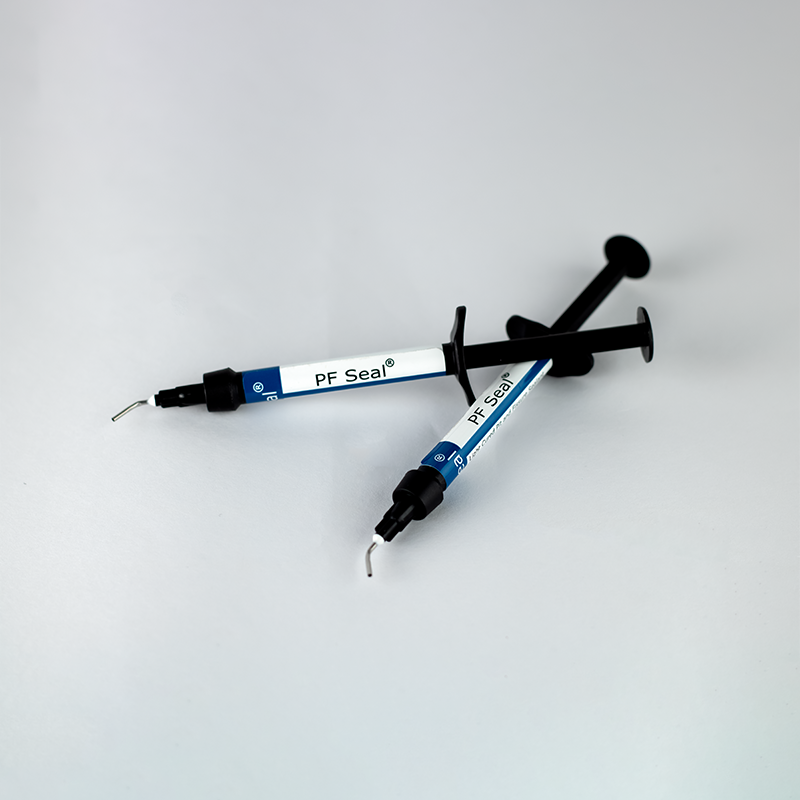 Application : Remove the protective cap from the syringe. Screw a new cannula onto the PF Seal syringe. PF Seal flows homogeneously from the cannula upon medium pressure and thus is very easy to dispense accurately. Apply PF Seal from the margin into the fissure or cavity and allow it to penetrate for 15 – 20sec. Remove any air bubbles with the fine cannula.
